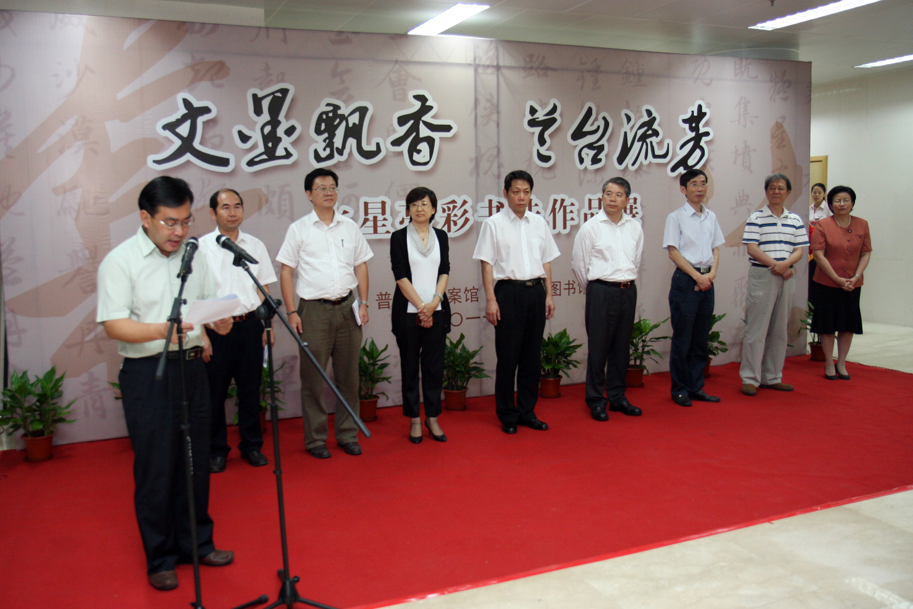 为弘扬中华传统,传播档案文化,9月9日,普陀区档案馆与普陀区图书馆在区图书馆二楼展厅联合举办“文墨飘香、兰台流芳”——七星亮彩书法作品展。普陀区文化局副局长范文翔主持开展仪式,区档案局副局长康国强在开幕式上致辞,书法作者代表、上海市书法家协会会员张忠先生发言。市档案局副局长杨智敏,普陀区委常委、宣传部部长祝学军,市书法家协会理事徐铁君为书法展开幕剪彩。区相关委办局领导、各街镇档案工作分管领导及机关、街镇档案干部、书法界人士等近百人出席了开幕式。书法展开幕当天,吸引了普陀区机关干部、书法爱好者、社区居民等社会各界人士前来参观,反响热烈,广受好评。展览现场还发放了《追忆——普陀历史档案剪影》等档案宣传资料,书法展将于9月19日闭幕。