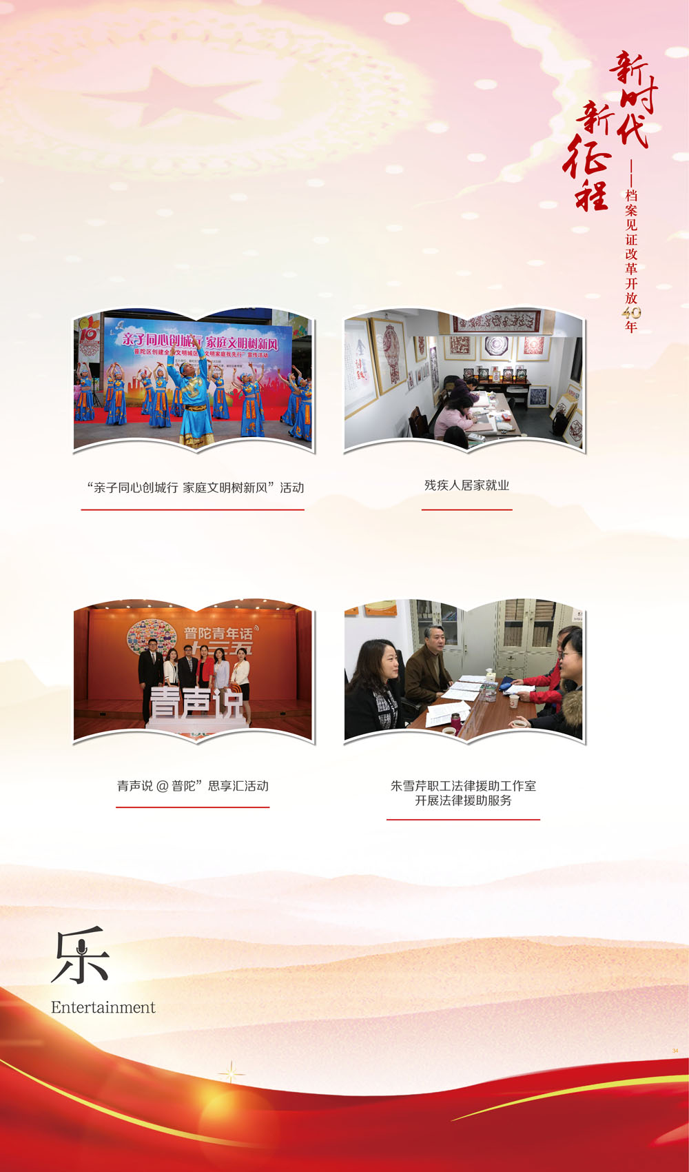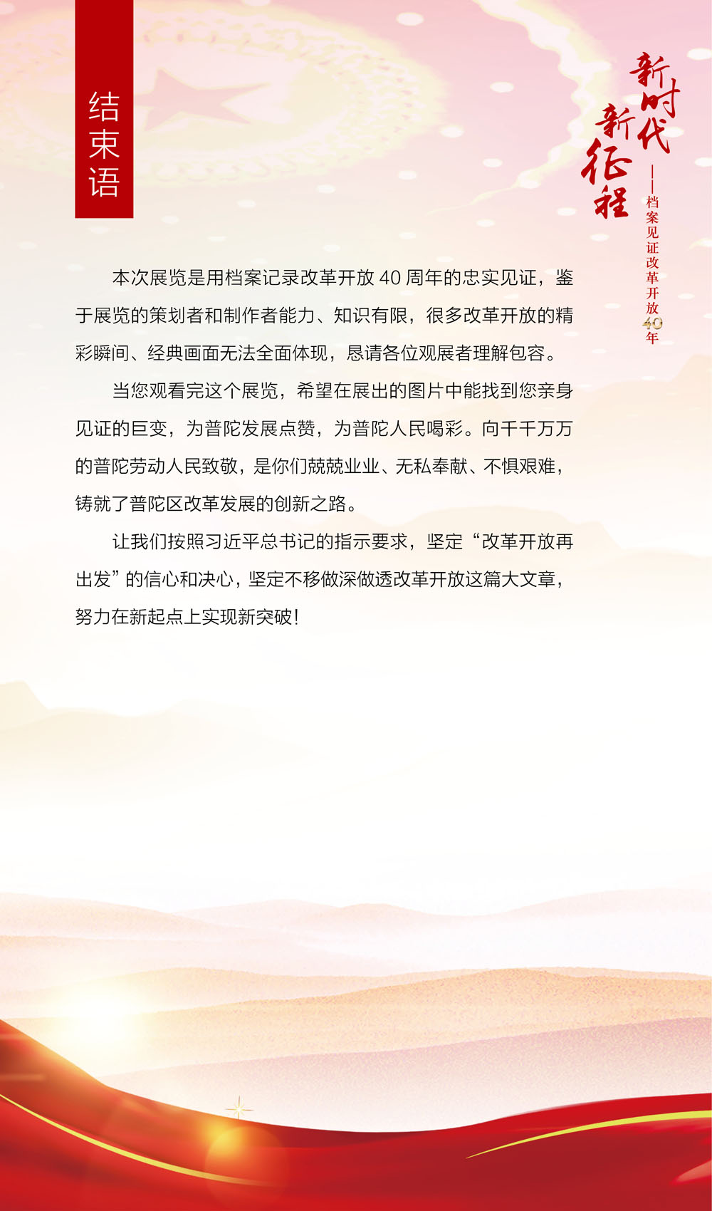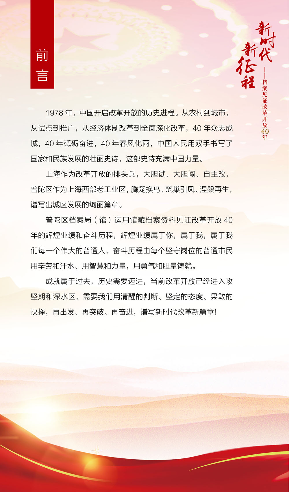 普陀区档案局(馆)、普陀区方志办联合主办《新时代 新征程——档案见证改革开放40年图片展》,展览利用档案馆馆藏照片档案为基础,动员各界力量,意图用大量的照片,真实呈现人民群众行、住、购、保、绿、乐等方面发生的翻天覆地的变化,展现改革开放40年的辉煌成就。