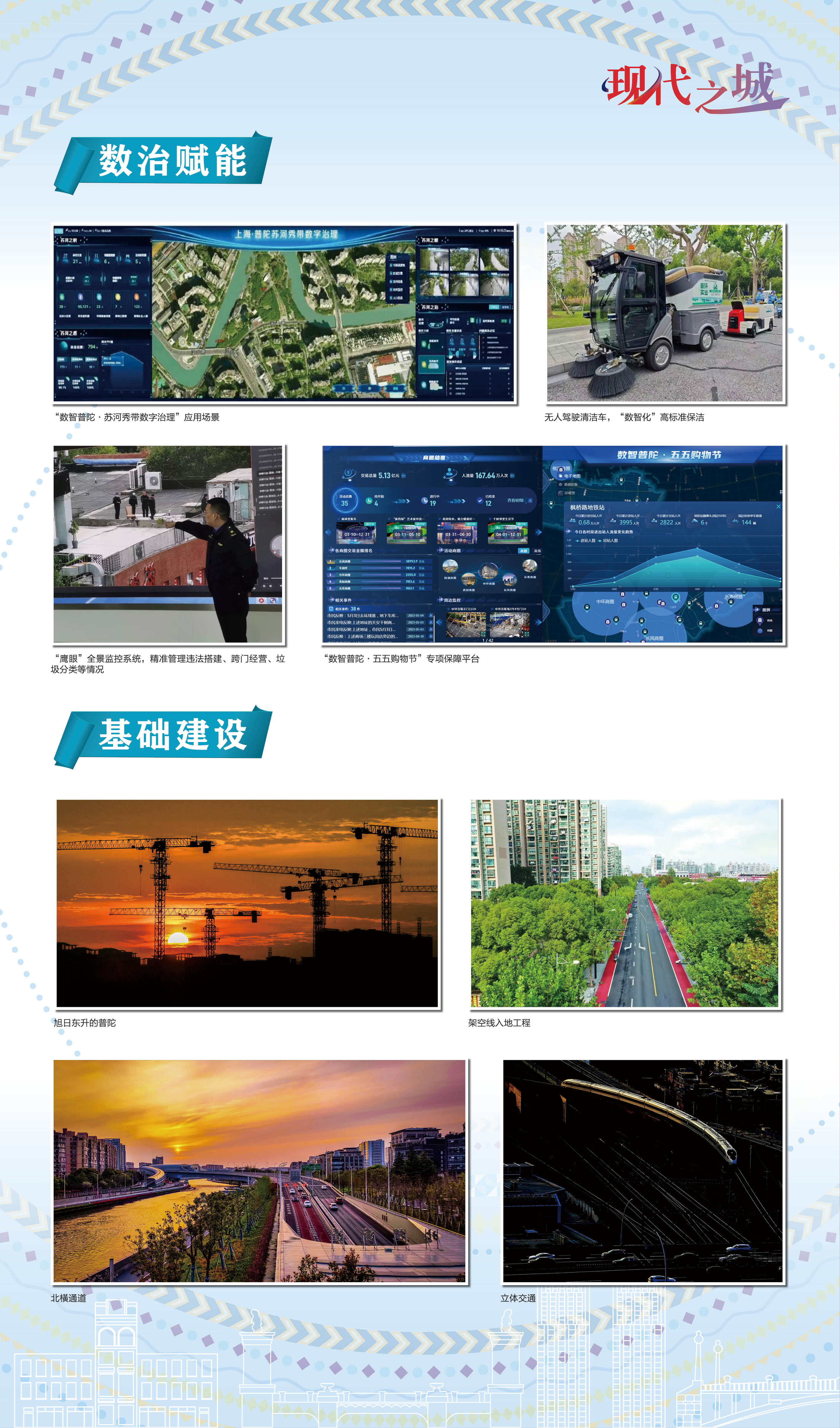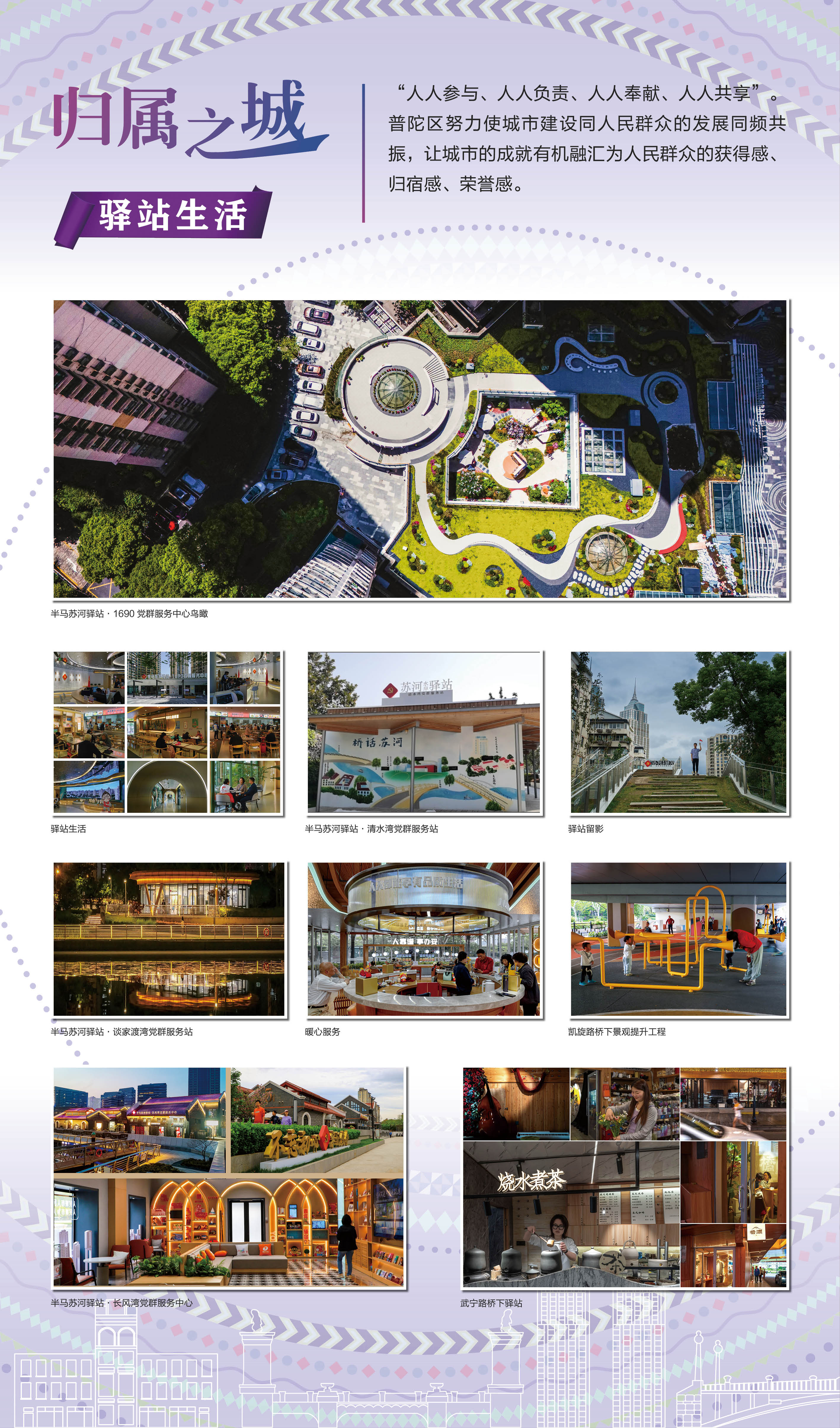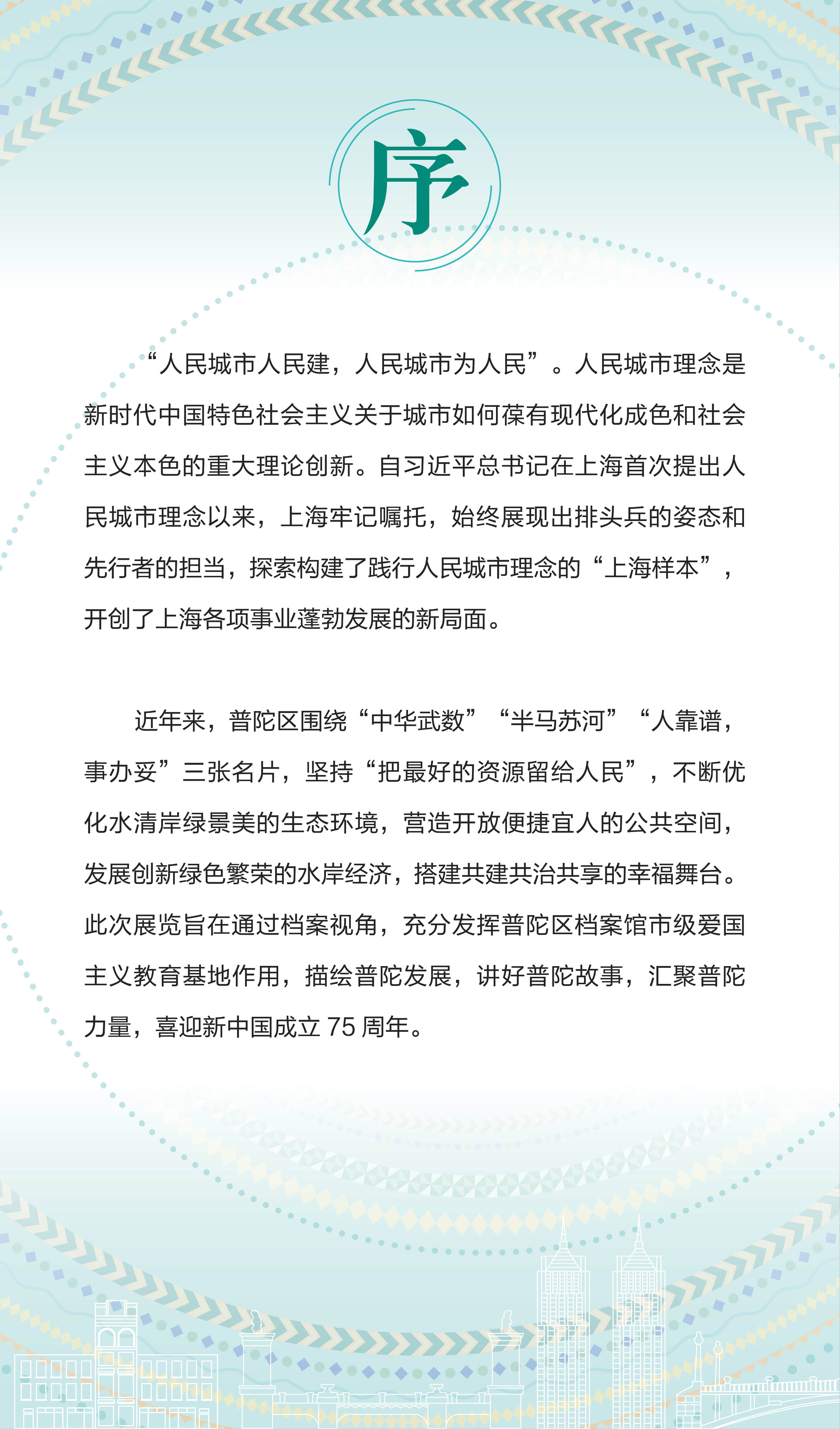 近年来,普陀区围绕“中华武数”“半马苏河”“人靠谱,事办妥”三张名片,坚持“把最好的资源留给人民”,不断优化水清岸绿景美的生态环境,营造开放便捷宜人的公共空间,发展创新绿色繁荣的水岸经济,搭建共建共治共享的幸福舞台。此次展览旨在通过档案视角,充分发挥普陀区档案馆市级爱国主义教育基地作用,描绘普陀发展,讲好普陀故事,汇聚普陀力量,喜迎新中国成立 75 周年。